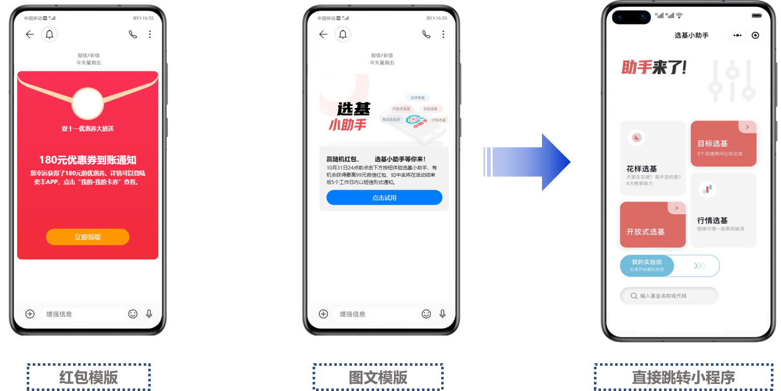 现在不管是APP还是小程序,拉新促活的成本都越来越高,尤其针对金融行业的用户运营来说,除了简单的引导用户下载APP,更重要是顺利获得运营手段激活用户,转化为有价值的用户。从这一点出发,evo真人视讯科技5G消息解决方案新增了多种样式的消息模板,支持采用图文+红包文案的方式助力基金行业高效拉新促活。