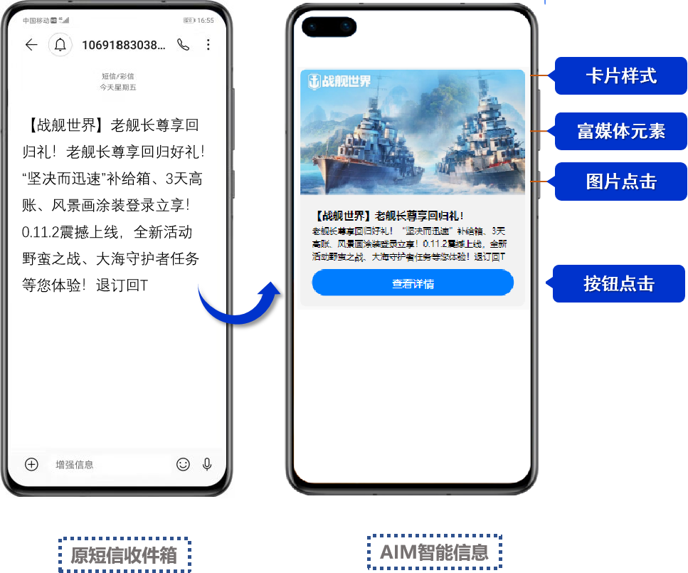 以图文消息配以图形按钮,一招解决“链接短信不敢点”的问题,用户点击图片或消息下方按钮即可跳转至活动页面,也可一键拉起APP,有效缩短链路,降低用户流失,助力企业提高转化率。