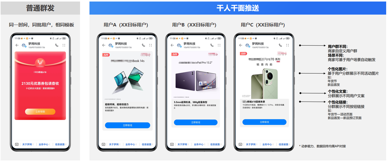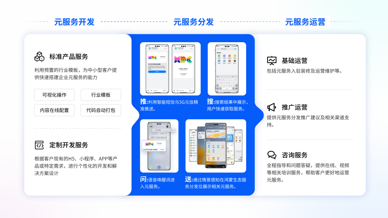 当前,evo真人视讯科技拥抱鸿蒙生态,已设立鸿蒙生态事业部,作为鸿蒙开发服务商,具备元服务开发、分发、运营的能力,5G元信正是元服务分发体系中重要且独特的方式。其融合华为终端强大的标签体系及全行业全场景的富媒体智能消息样式,帮助企业实现对用户群体的精细化营销有助于业务新增长。